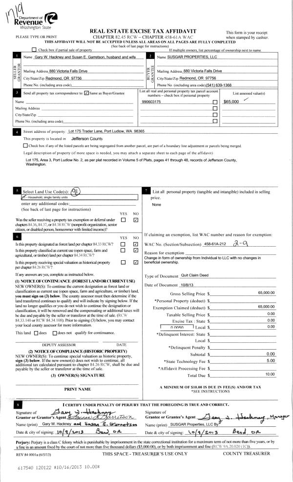 | 1 | 08/21/2014 | REC | Real Estate Contract | ARVID J MARQUARDT TRSTE | ARTHUR J & TERRIE K BARROWS | | | $47,500.00 | 121777 | |