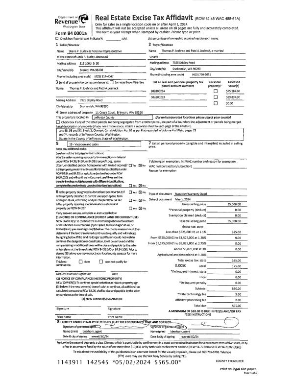 | 1 | 05/01/2024 | SWD | Statutory Warranty Deed | LINDA RAE BURLEY | THOMAS P & PATTI A JOEHNCK | | | $35,000.00 | 142545 | |