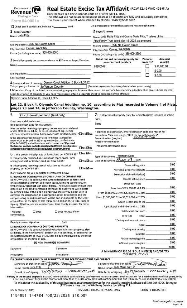 | 1 | 08/19/2025 | WD | Warranty Deed | JADA FRITZ | FRITZ FAMILY TRUST | | | | 144784 | |