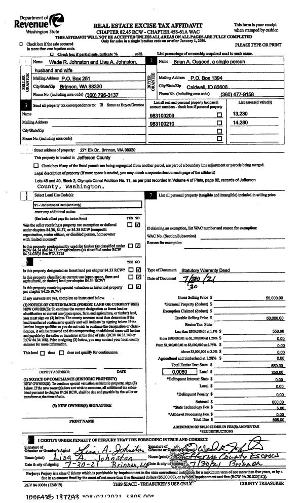 | 1 | 07/30/2021 | SWD | Statutory Warranty Deed | WADE R JOHNSTON | BRIAN A OSGOOD | | | $50,000.00 | 137293 | |