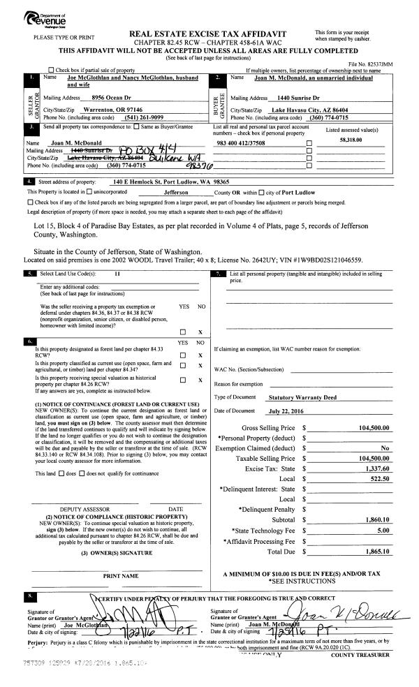 | 2 | 07/22/2016 | SWD | Statutory Warranty Deed | JOE MC GLOTHLAN | JOAN M MC DONALD | | | $104,500.00 | 125929 | |