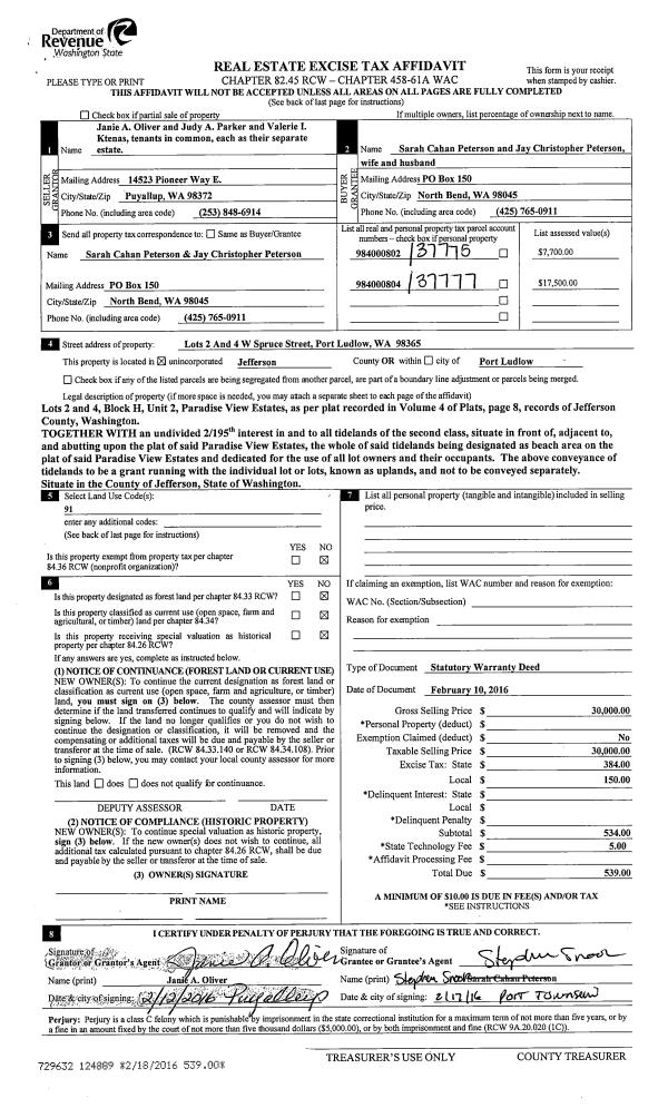 | 3 | 02/10/2016 | SWD | Statutory Warranty Deed | JANE A OLIVER | SARAH PETERSON | | | $30,000.00 | 124889 | |