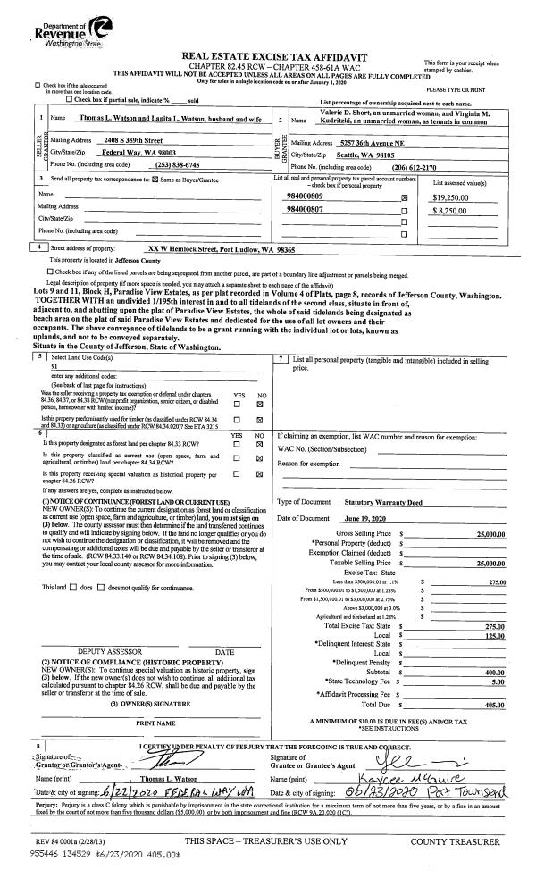 | 1 | 06/19/2020 | SWD | Statutory Warranty Deed | LANITA WATSON | VALERIE D SHORT | | | $25,000.00 | 134529 | |