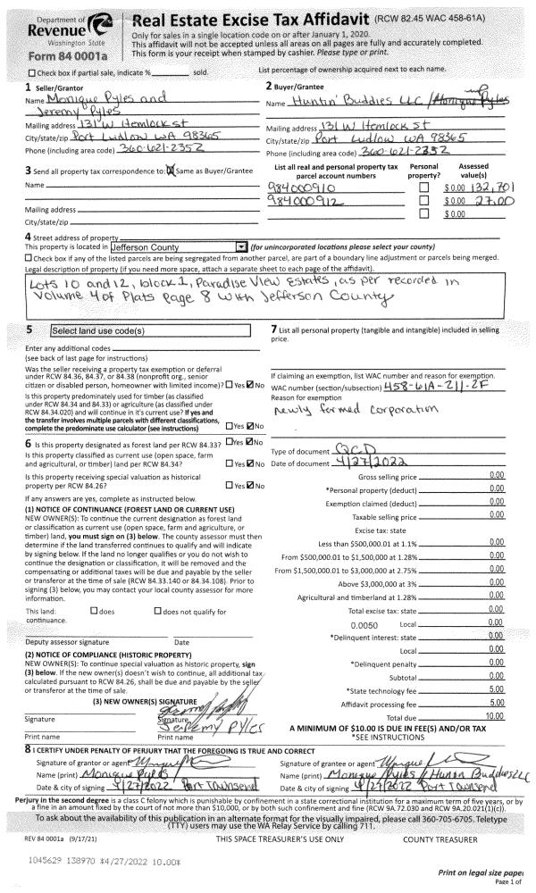 | 4 | 04/27/2022 | QCD | Quit Claim Deed | MONIQUE D & JEREMY J PYLES | HUNTIN BUDDIES LLC | | | | 138970 | |