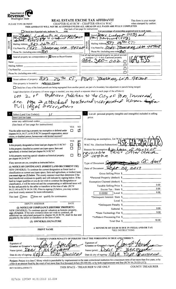 | 2 | 09/29/2017 | QCD | Quit Claim Deed | VIENO V LINDQUIST TRSTE | JAMES LINDQUIST | | | | 129349 | |