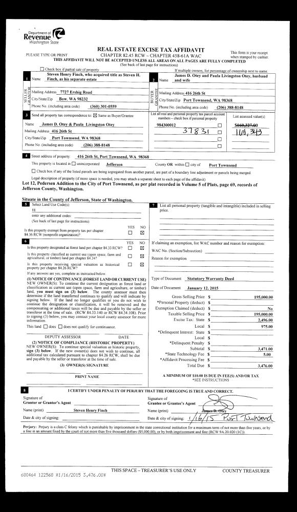 | 1 | 01/12/2015 | SWD | Statutory Warranty Deed | STEVEN H FINCH | JAMES OTEY | | | $195,000.00 | 122568 | |