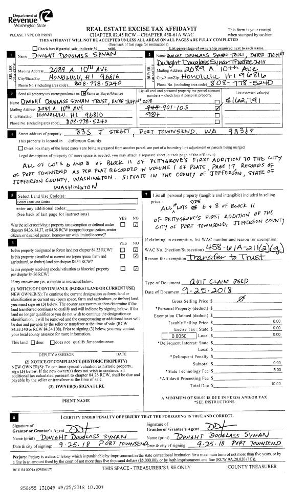 | 2 | 09/25/2018 | QCD | Quit Claim Deed | DWIGHT SYNAN | DWIGHT D SYNAN TRUST | | | | 131049 | |