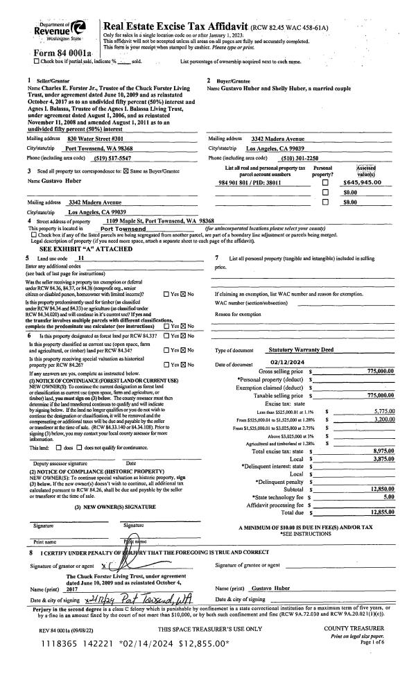 | 1 | 02/12/2024 | SWD | Statutory Warranty Deed | CHARLES E FORSTER TRSTE | GUSTAVO & SHELLY HUBER | | | $775,000.00 | 142221 | |