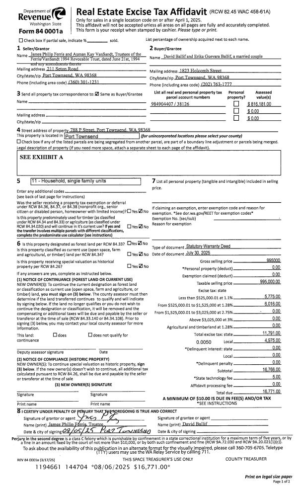 | 1 | 07/30/2025 | SWD | Statutory Warranty Deed | FERRIS/VANSANDT 1994 REV TRUST | DAVID BALLIF | | | $995,000.00 | 144704 | |