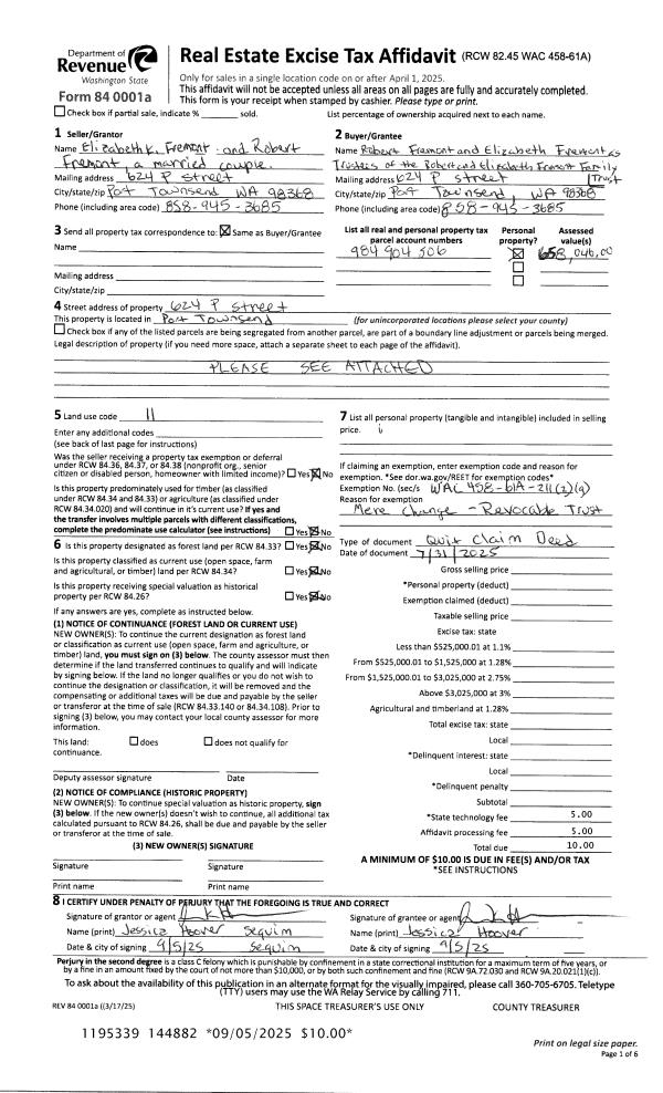 | 1 | 07/31/2025 | QCD | Quit Claim Deed | ELIZABETH & ROBERT FREMONT | FREMONT FAMILY TRUST | | | | 144882 | |