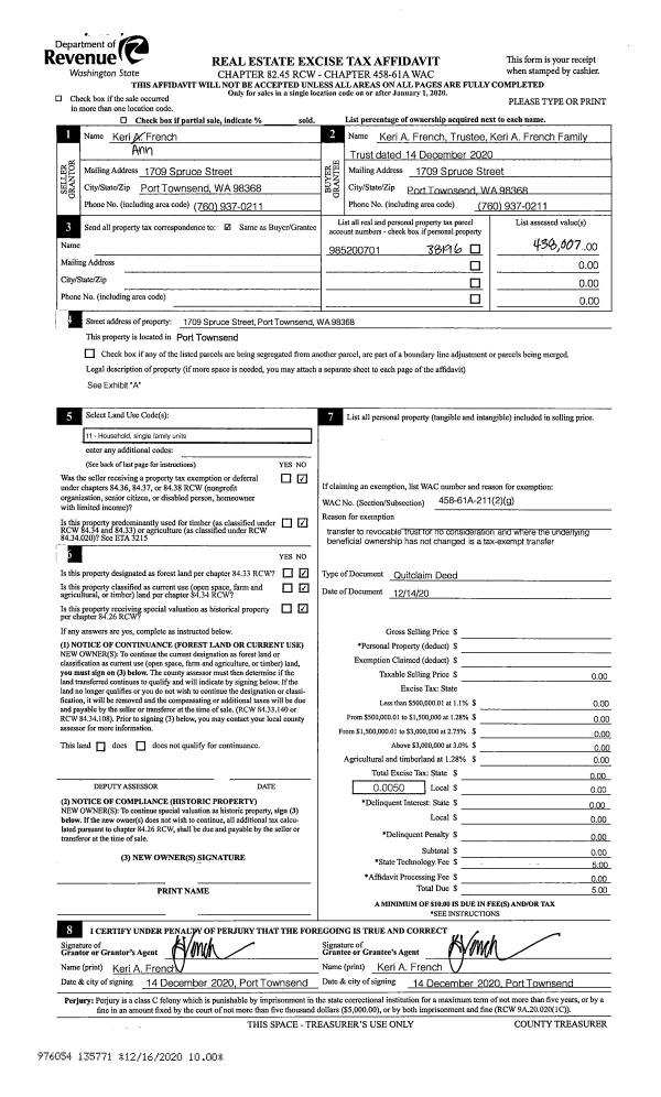 | Mailing Address: | KERI A FRENCH TRUSTEE 1709 SPRUCE ST PORT TOWNSEND, WA 98368-2731 | % Ownership: | 100.0000000000% |