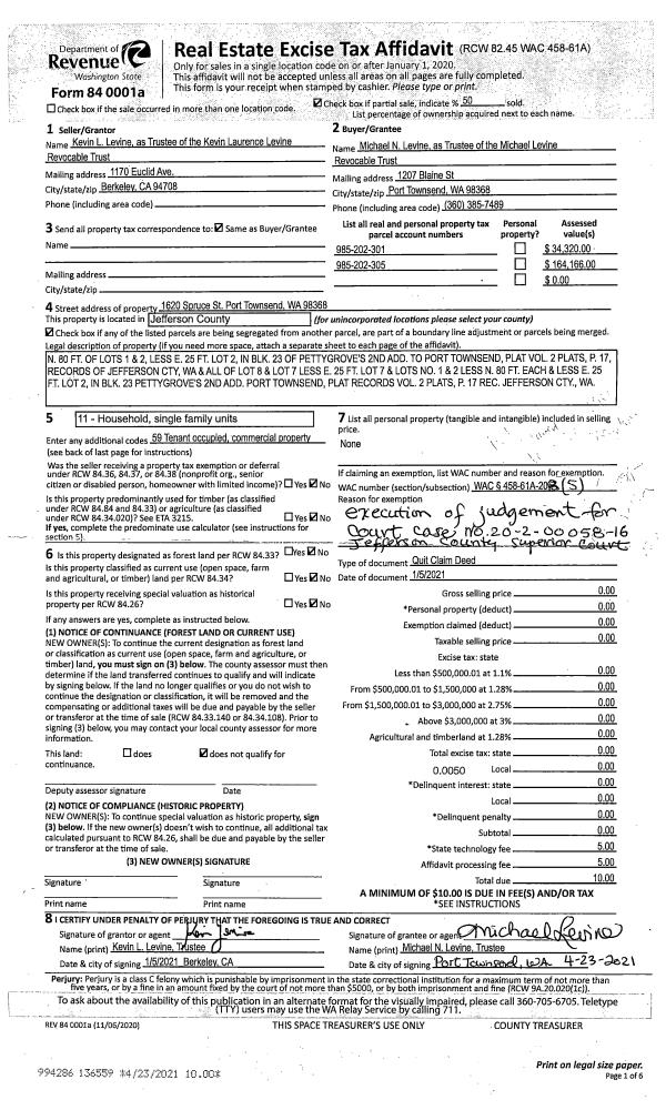 | 1 | 01/05/2021 | QCD | Quit Claim Deed | MICHAEL LEVINE TRSTEE | MICHAEL LEVINE REV LIVING TRUST | | | | 136559 | |