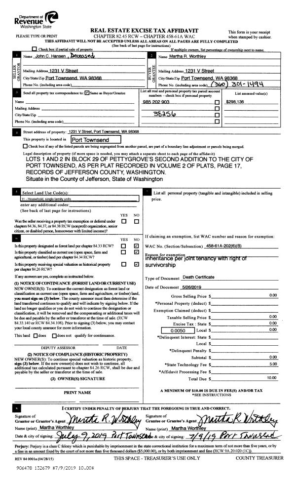 | 2 | 08/23/2016 | QCD | Quit Claim Deed | MARTHA R WORTHLEY | JOHN C HANSEN & MARTHA R WORTHLEY JTWROS | | | | 126112 | |