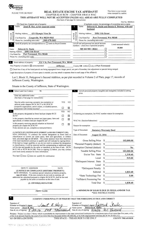 | 1 | 08/22/2016 | SWD | Statutory Warranty Deed | JANET RUTH HOY | DEBORAH STEELE & DENNIS DANEAU | | | $103,000.00 | 126163 | |