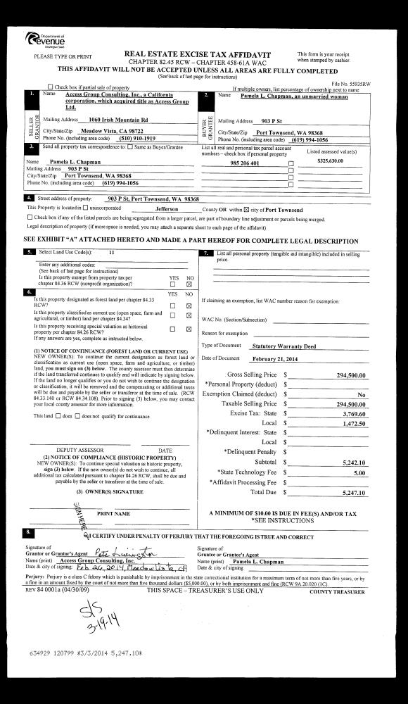 | 1 | 02/21/2014 | SWD | Statutory Warranty Deed | ACCESS GROUP LTD | PAMELA CHAPMAN | | | $294,500.00 | 120799 | |