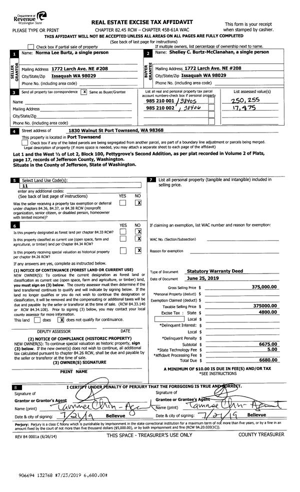 | 1 | 06/25/2019 | SWD | Statutory Warranty Deed | NORMA L BURTZ | SHELLEY C BURTZ MCCLANAHAN | | | $375,000.00 | 132768 | |