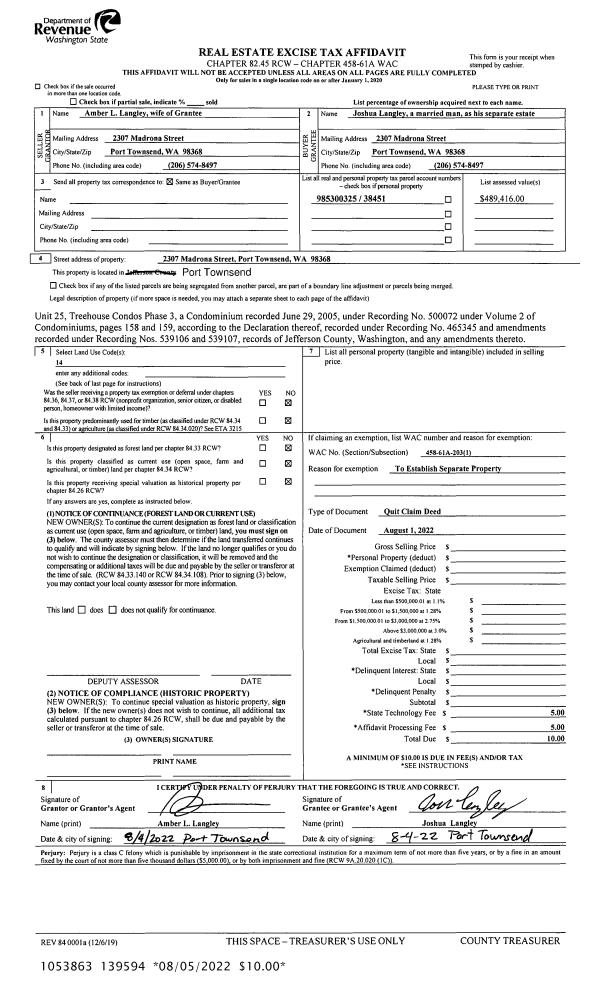 | 1 | 08/01/2022 | QCD | Quit Claim Deed | AMBER L LANGLEY | JOSHUA D LANGLEY | | | | 139594 | |