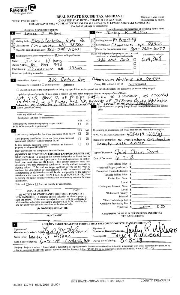 | 3 | 06/07/2018 | QCD | Quit Claim Deed | TURLEY R WILSON | TURLEY R WILSON | | | | 130744 | |