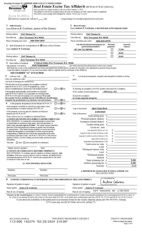 | 1 | 02/29/2024 | QCD | Quit Claim Deed | GENEVA R COCHRANE | ANDREW COCHRANE | | | | 142274 | |