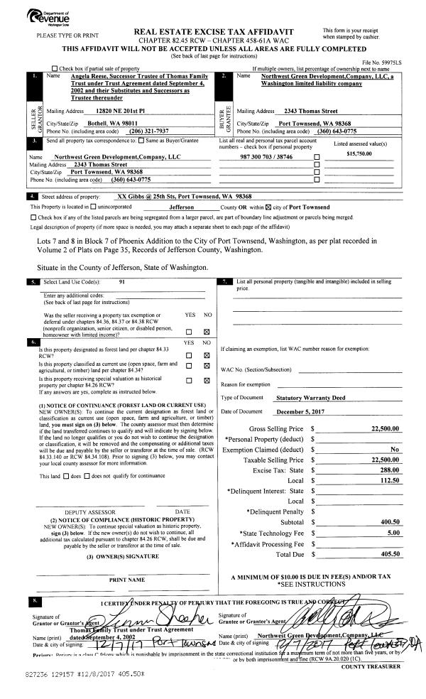 | 1 | 12/05/2017 | SWD | Statutory Warranty Deed | ROBERT E THOMAS TRUSTEE | NORTHWEST GREEN DEVELOPMENT CO | | | $22,500.00 | 129157 | |