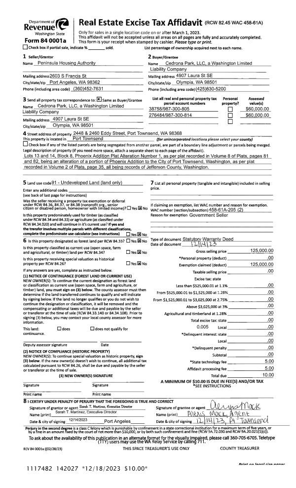 | 1 | 12/14/2023 | SWD | Statutory Warranty Deed | PENINSULA HOUSING AUTHORITY | CEDRONA PARK LLC | | | $125,000.00 | 142027 | |