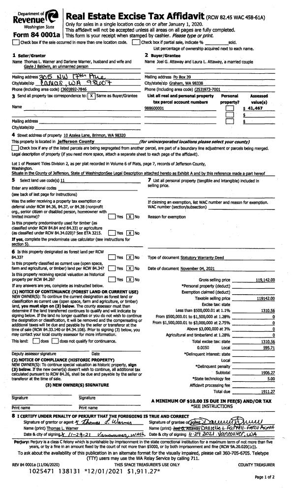 | 1 | 11/04/2021 | SWD | Statutory Warranty Deed | THOMAS L & DARLENE M WARNER | JOEL G & LAURA L ATTAWAY | | | $119,142.00 | 138131 | |