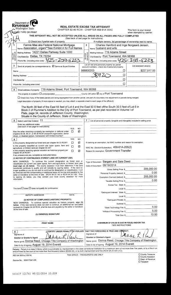 | 2 | 08/19/2014 | BSD | Bargain and Sale Deed | FEDERAL NATIONAL MORTGAGE ASSOCIATION | CHARLES S HANIFORD | | | $205,000.00 | 121761 | |