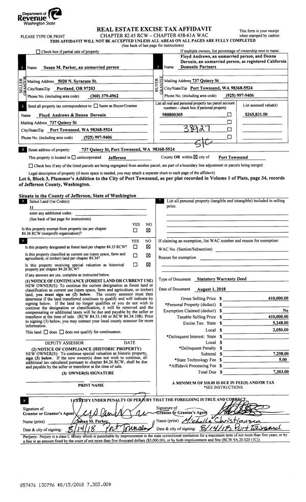 | 1 | 08/01/2018 | SWD | Statutory Warranty Deed | JERYL L PARKER | FLOYD ANDREWS | | | $410,000.00 | 130796 | |