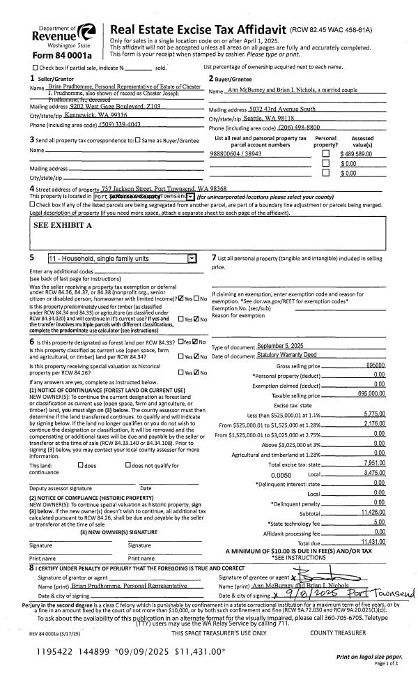| 1 | 09/05/2025 | SWD | Statutory Warranty Deed | CHESTER PRUDHOMME | ANN MCBURNEY & BRIAN NICHOLS | | | $695,000.00 | 144899 | |
