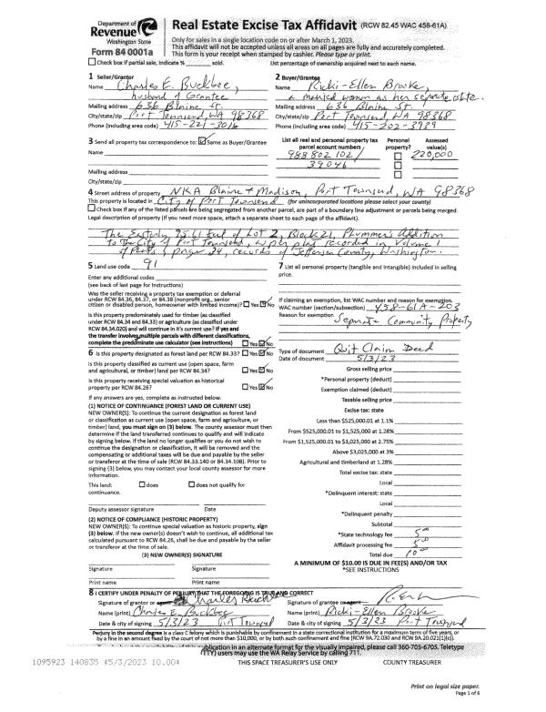 | 1 | 05/03/2023 | QCD | Quit Claim Deed | RICKI ELLEN BROOKE & CHARLES E BUCKBEE | RICKI ELLEN BROOKE | | | | 140835 | |