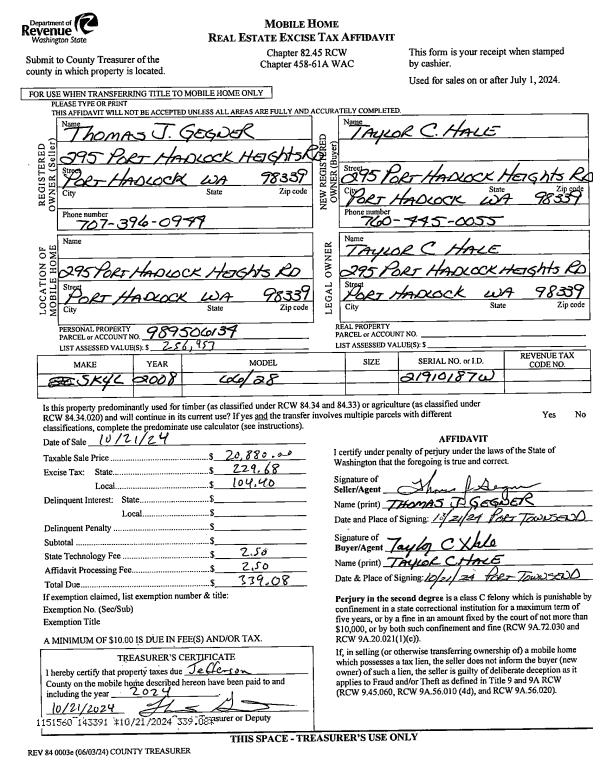 | 1 | 10/21/2024 | MH | Mobile Home | THOMAS J GEGNER | TAYLOR C HALE | | | $20,880.00 | 143391 | |