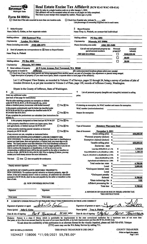 | 1 | 11/02/2021 | SWD | Statutory Warranty Deed | JULIA G GOINS | TROY A PICKETT | | | $600,000.00 | 138006 | |