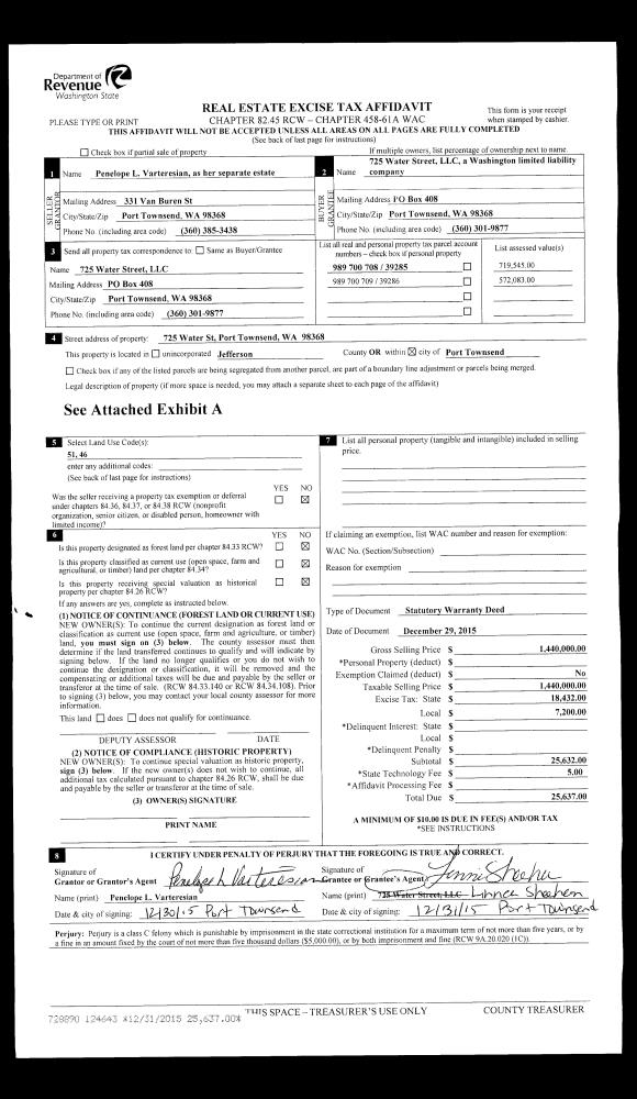 | 1 | 12/29/2015 | SWD | Statutory Warranty Deed | PENELOPE L VARTERESIAN | 725 WATER STREET LLC | | | $1,440,000.00 | 124643 | |
