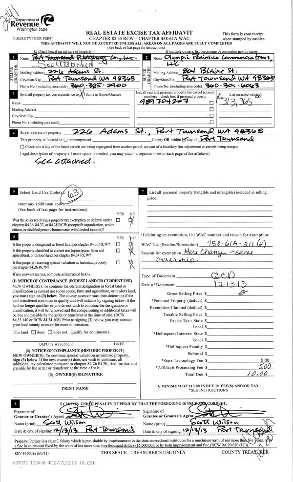 | 3 | 12/13/2013 | QCD | Quit Claim Deed | LEADER CO | OLYMPIC PENINSULA COMMUNICATIONS LLC | | | | 120436 | |