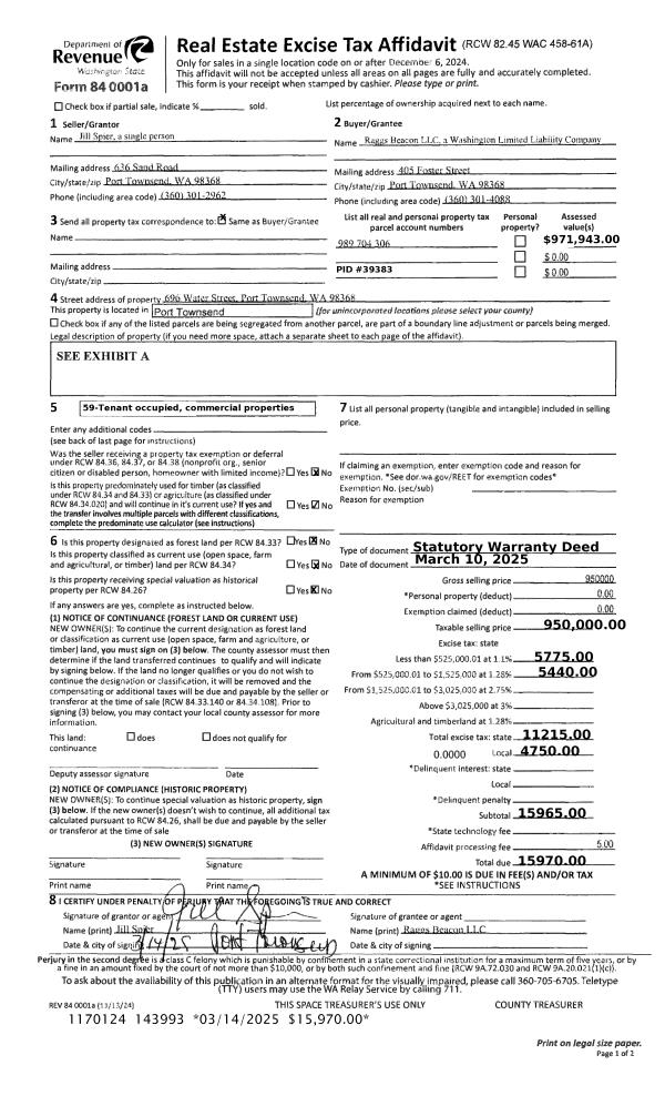 | 1 | 03/10/2025 | SWD | Statutory Warranty Deed | JILL SPIER | RAGGS BEACON LLC | | | $950,000.00 | 143993 | |