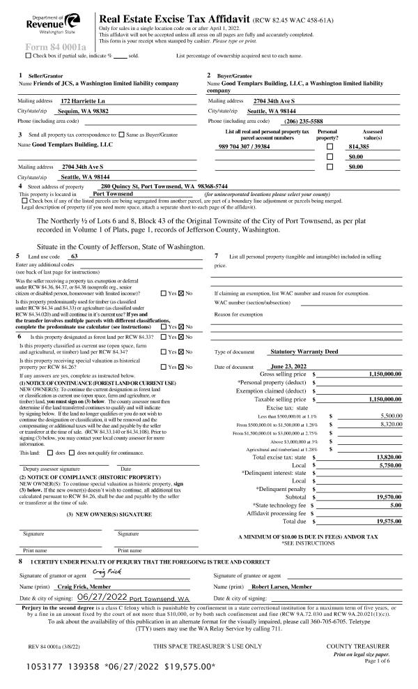| 1 | 06/23/2022 | SWD | Statutory Warranty Deed | FRIENDS OF JCS LLC | GOOD TEMPLARS BUILDING LLC | | | $1,150,000.00 | 139358 | |