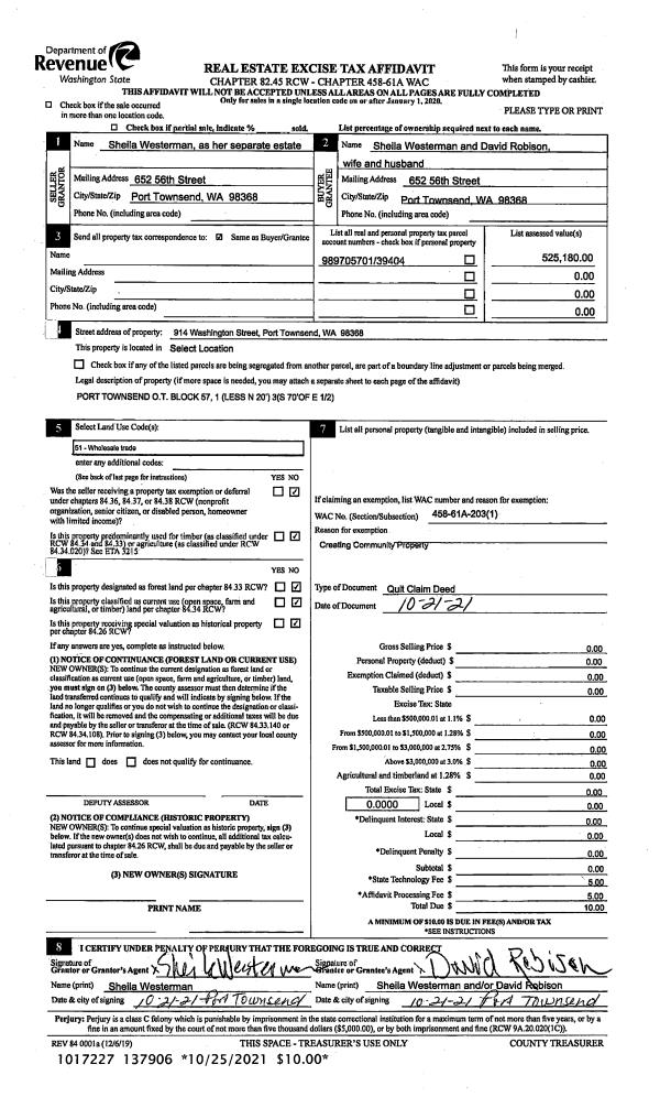 | 1 | 10/21/2021 | QCD | Quit Claim Deed | SHEILA A WESTERMAN | SHEILA WESTERMAN & DAVID ROBISON | | | | 137906 | |