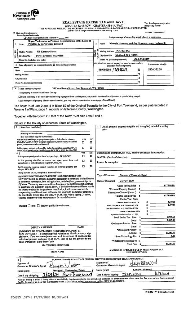 | 2 | 07/27/2020 | SWD | Statutory Warranty Deed | PENELOPE L VARTERESIAN | KIMARIE S & JAY A HENWOOD | | | $617,000.00 | 134741 | |