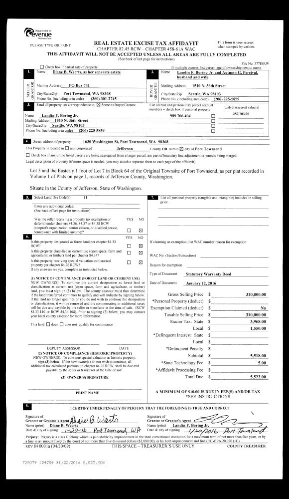 | 1 | 01/12/2016 | SWD | Statutory Warranty Deed | DIANE B WEERTS | LANDIN F BORING JR & AUTUMN G PERCIVAL | | | $310,000.00 | 124754 | |