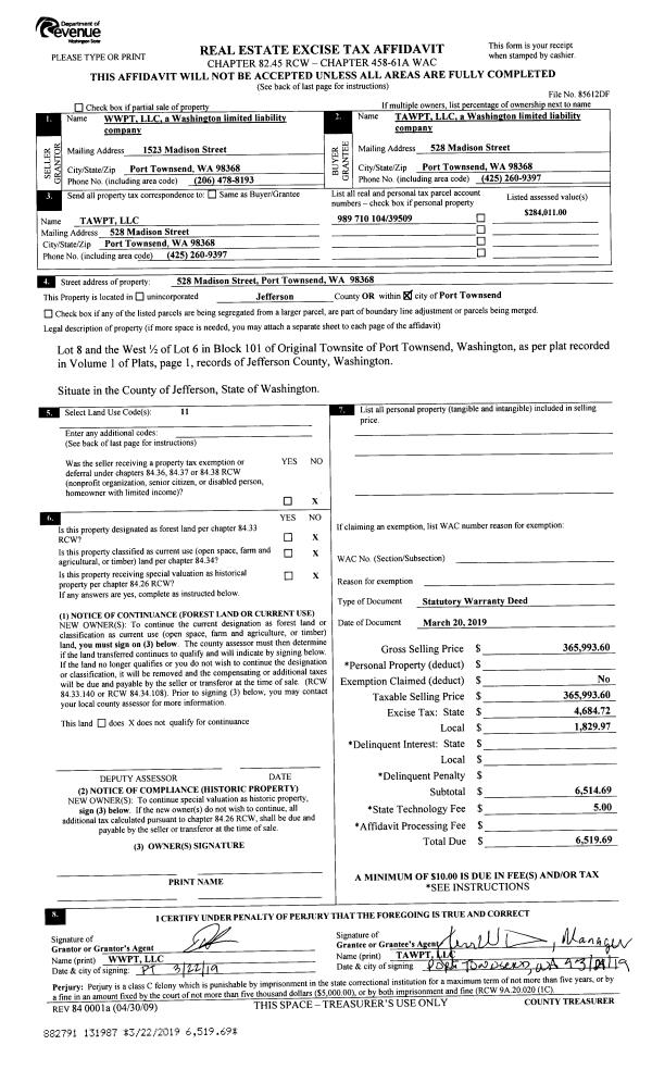 | 1 | 03/20/2019 | SWD | Statutory Warranty Deed | WWPT LLC | TAWPT LLC | | | $365,994.00 | 131987 | |