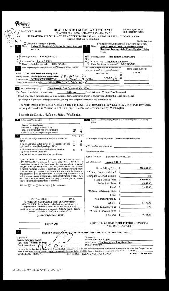 | 2 | 08/06/2014 | SWD | Statutory Warranty Deed | ANDREW D & CATHERINE W SIEGEL | TENCH-HAMILTON LIVING TRUST | | | $320,000.00 | 121769 | |
