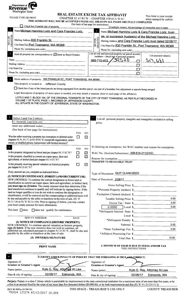 | 2 | 02/28/2017 | QCD | Quit Claim Deed | MICHAEL & CARA LORIZ | MICHAEL H & CARA F LORIZ TRUST | | | | 127274 | |