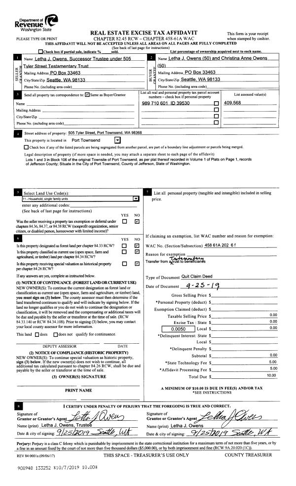 | Mailing Address: | CHRISTINA A OWENS 505 TYLER ST PORT TOWNSEND, WA 98368 | % Ownership: | 100.0000000000% |