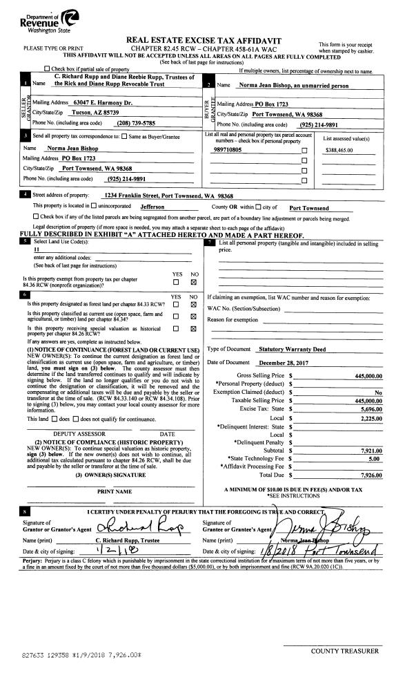 | 1 | 12/28/2017 | SWD | Statutory Warranty Deed | RICK & DIANE RUPP REV TRUST | NORMA BISHOP | | | $445,000.00 | 129358 | |