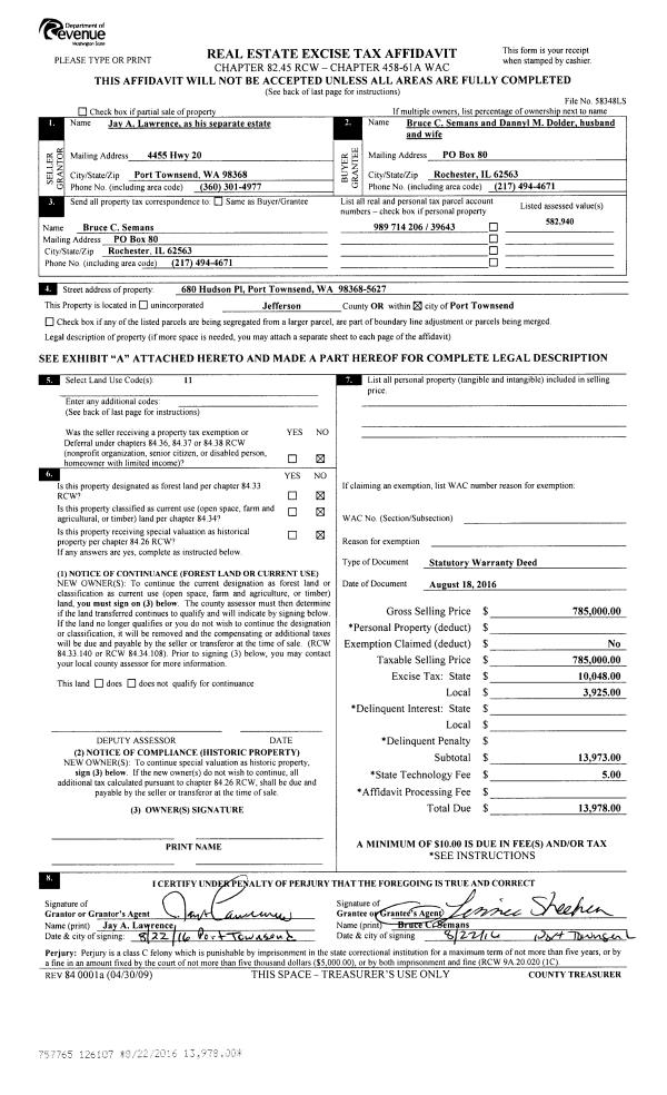 | 6 | 08/18/2016 | SWD | Statutory Warranty Deed | JAY A LAWRENCE | BRUCE SEMANS & DANNYL DOLDER | | | $785,000.00 | 126107 | |