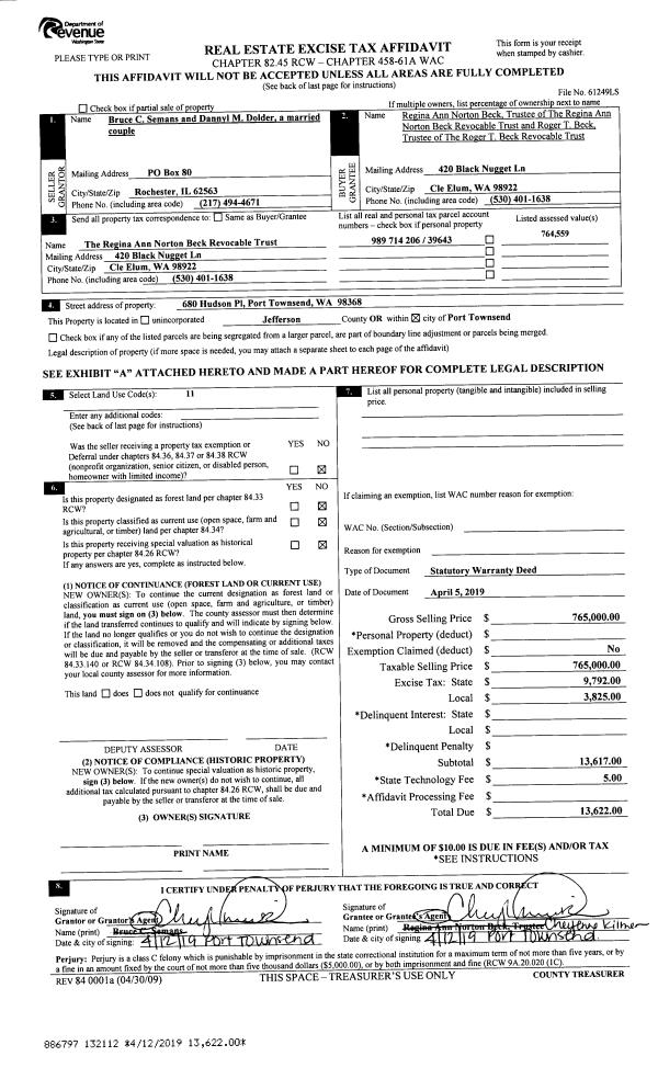 | 5 | 04/05/2019 | SWD | Statutory Warranty Deed | BRUCE SEMANS & DANNYL DOLDER | REGINA A NORTON BECK REVOCABLE TRUST | | | $765,000.00 | 132112 | |