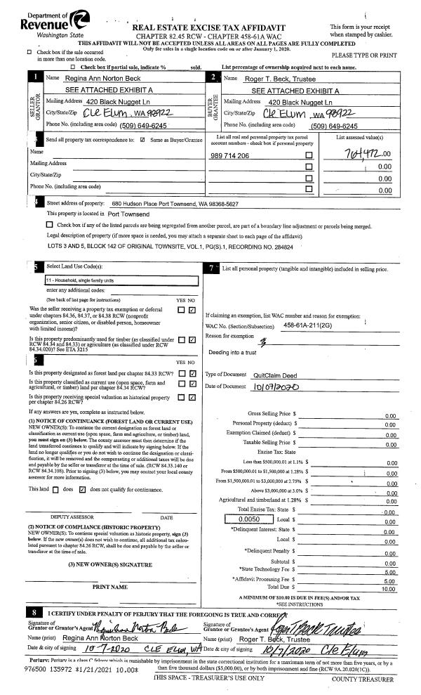 | 4 | 10/07/2020 | QCD | Quit Claim Deed | REGINA A NORTON BECK REVOCABLE TRUST | ROGER T BECK | | | | 135971 | |