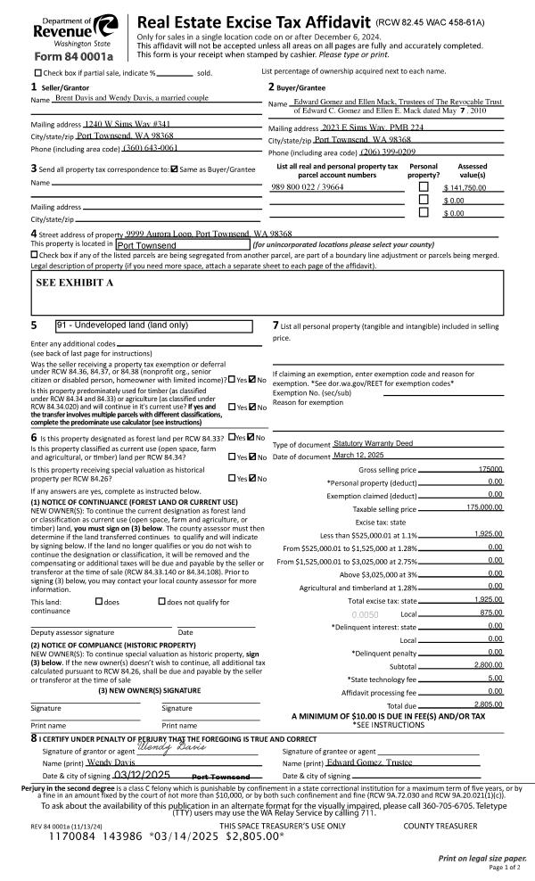 | 1 | 03/12/2025 | SWD | Statutory Warranty Deed | BRENT J & WENDY DAVIS | EDWARD C GOMEZ & ELLEN E MACK REVOCABLE TRUST | | | $175,000.00 | 143986 | |