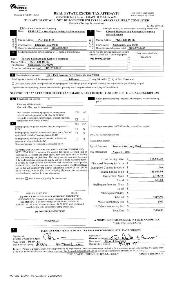 | 4 | 08/21/2019 | SWD | Statutory Warranty Deed | PTBP LLC | EDWARD & KATHLEEN EISSMANN | | | $115,500.00 | 132994 | |