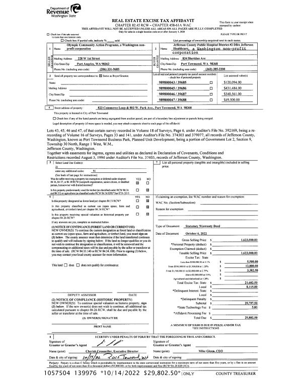 | 2 | 10/06/2022 | SWD | Statutory Warranty Deed | OLYMPIC COMMUNITY ACTION PROGR | JEFFERSON COUNTY PUBLIC HOSPITAL DISTRICT #2 | | | $1,623,000.00 | 139976 | |